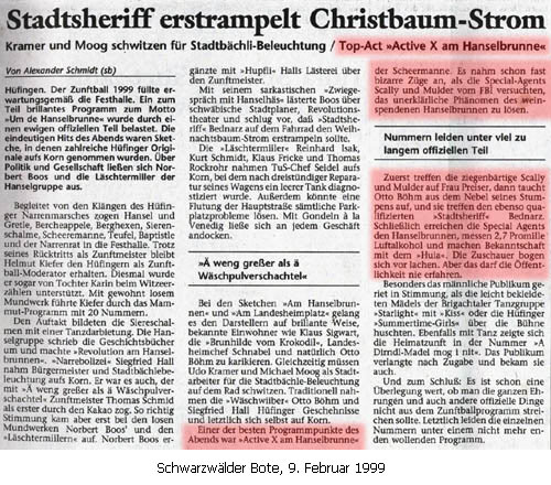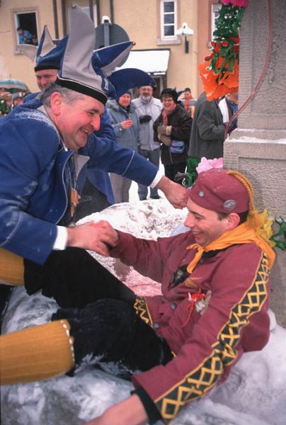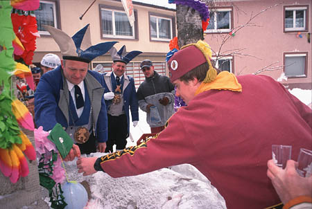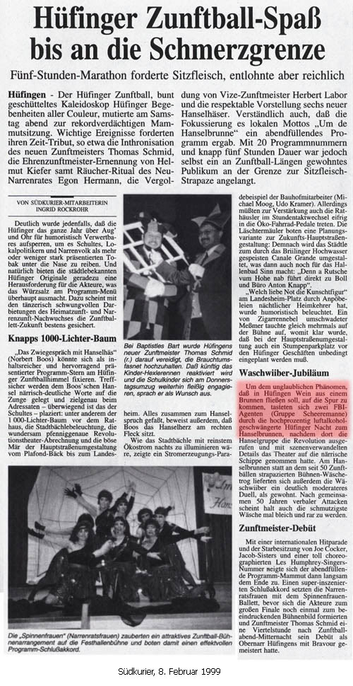 Anläßlich des 50-jährigen Bestehens des Hanselbrunnens (ein Narrenbrunnen in der Altstadt von Hüfingen) floß am "Schmutzigen Dunschtig" anstelle von Wasser Wein aus dem Brunnen.